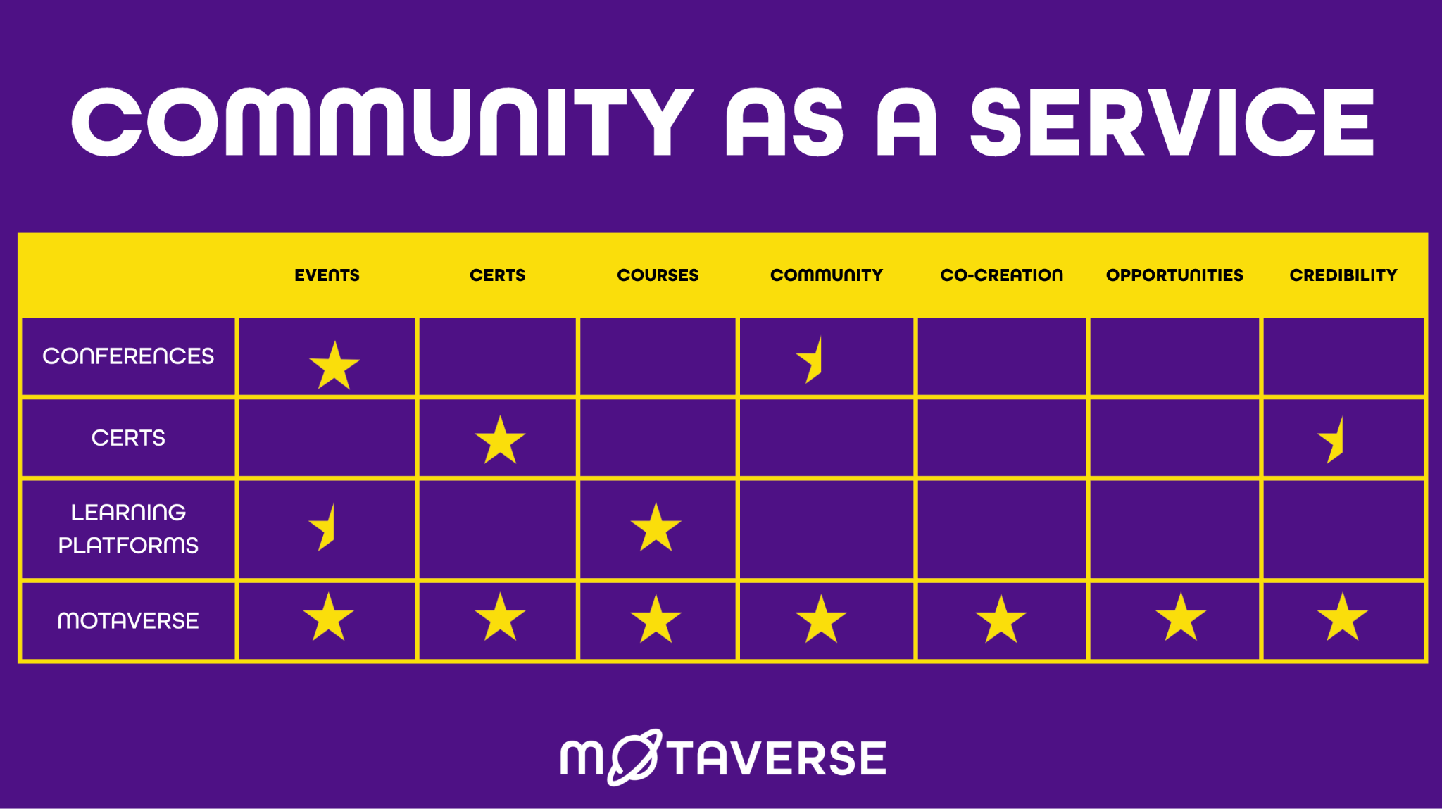 Community-as-a-Service (CaaS) is on our minds too, I had a great conversation with Simon Tomes on it, we hope to publish it soon. We’re working on defining clarity about what it means, but in a nutshell, and in the context of the MoTaverse, I see CaaS as something that encompasses supporting individuals and companies throughout their careers and goals.